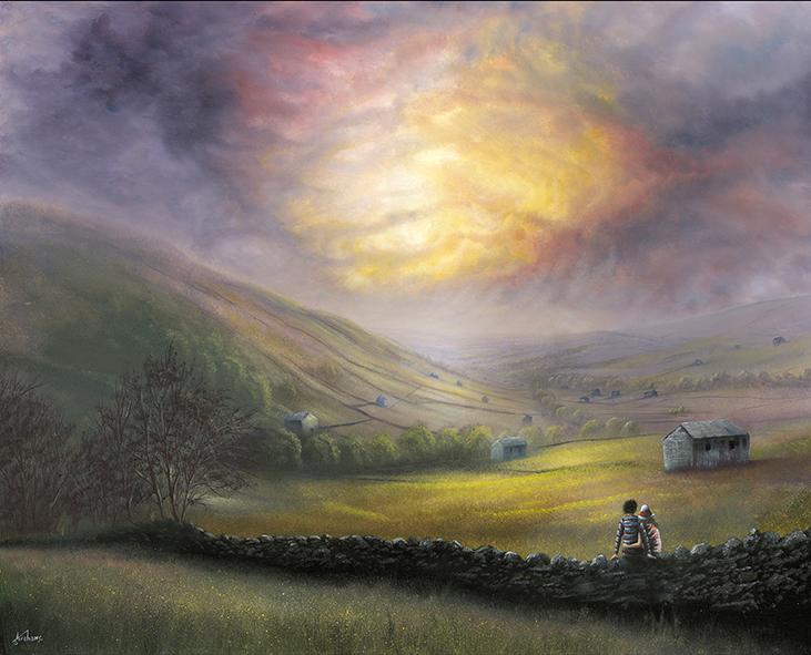 Experience the beauty of Swaledale with "A Romantic View" by Danny Abrahams. This stunning artwork captures the essence of the countryside with a couple sat admiring the picturesque landscape.