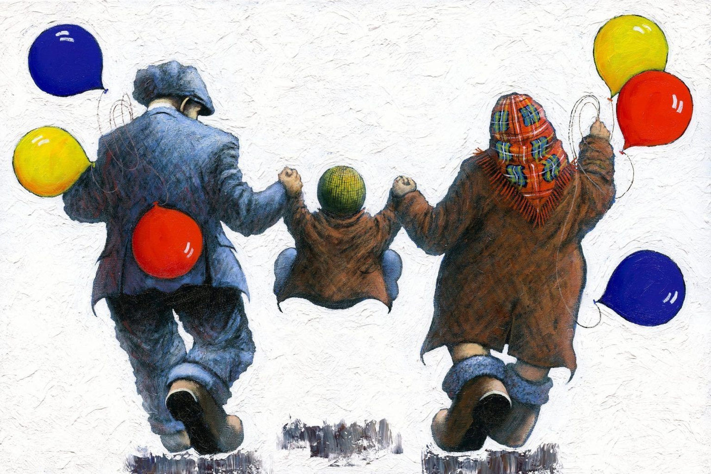 "This painting conveys a strong childhood memory of being swung in that air between Mam and Dad. The thrill of being held tightly by the hands and flying up into the air is a simple pleasure that almost every kid loves. And one that kids want to repeat over and over."