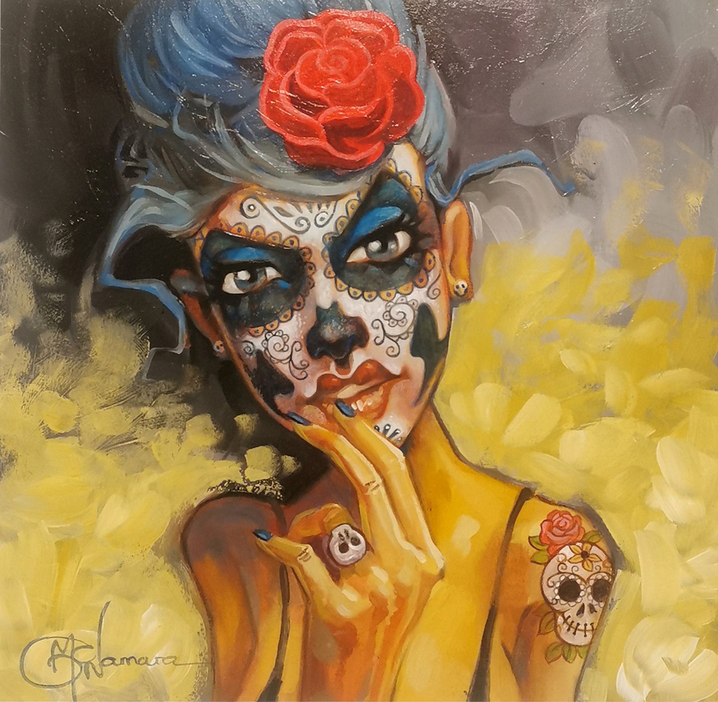 This original painting from Gary McNamara celebrates the 'Day Of The Dead' with vivid colours and intricate details. Featuring face paint, flowers this stunning piece is a homage to life and the beauty we find when honouring those who have passed.