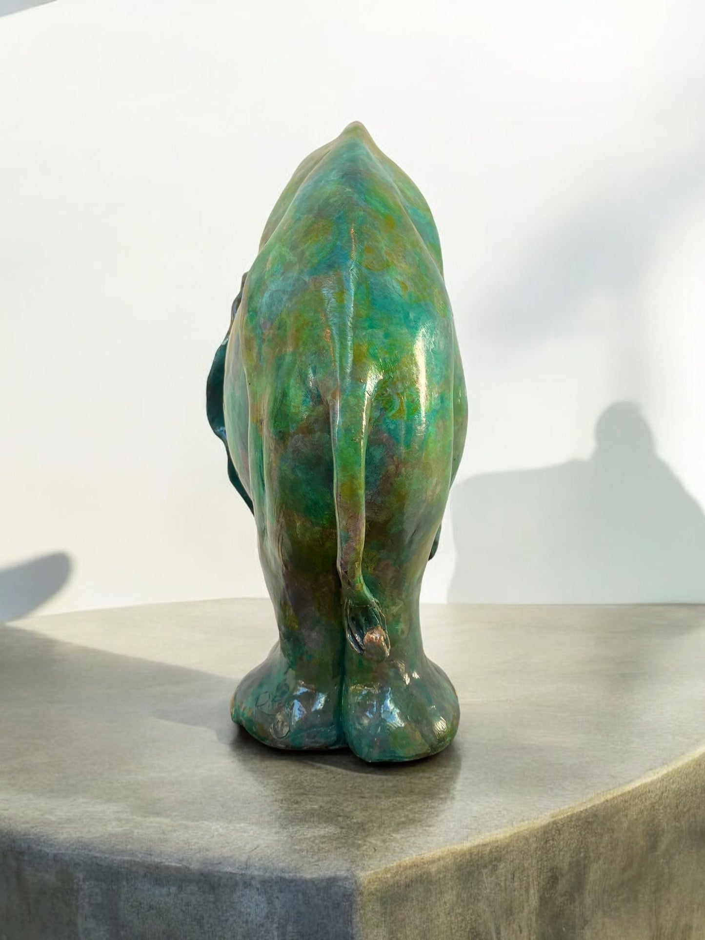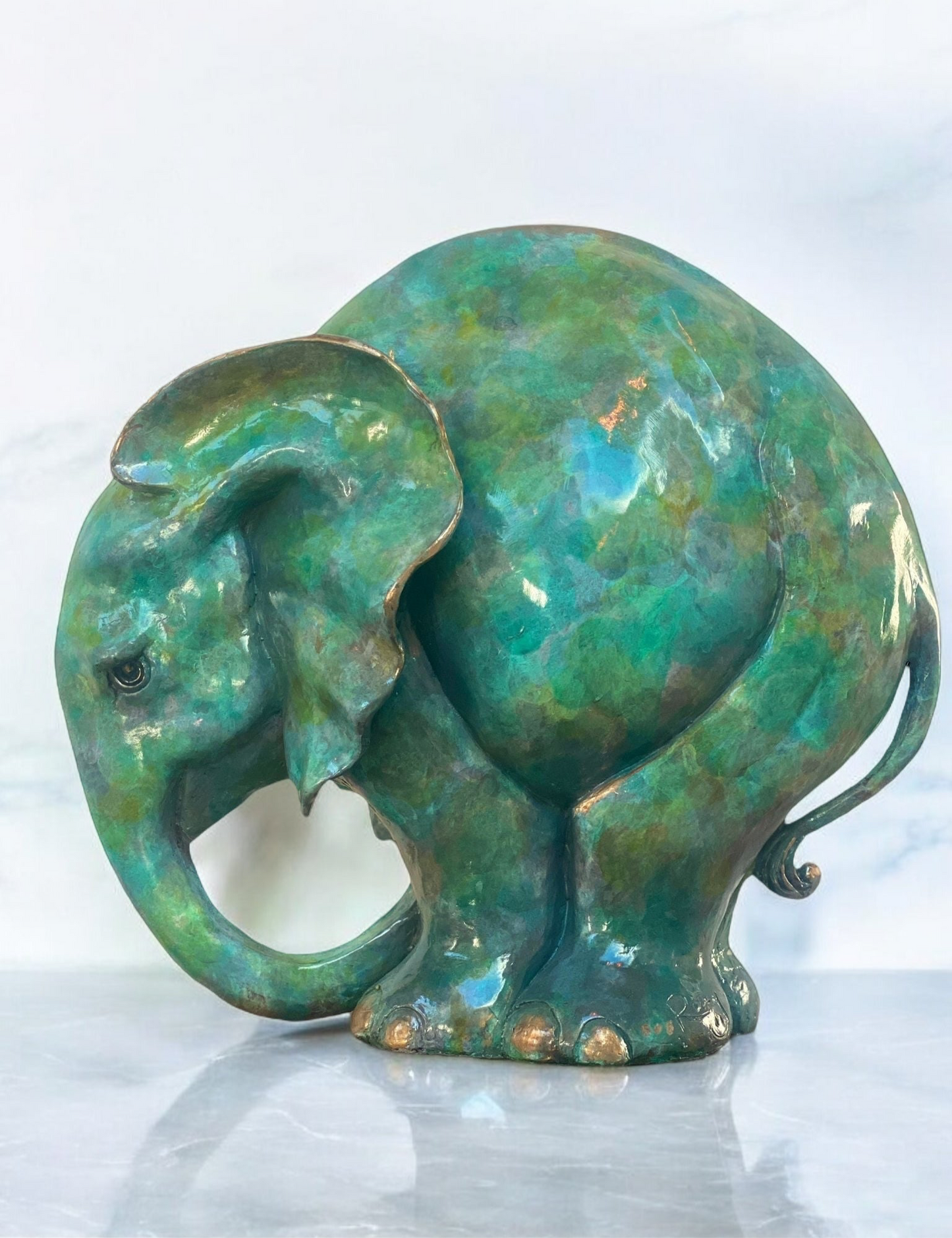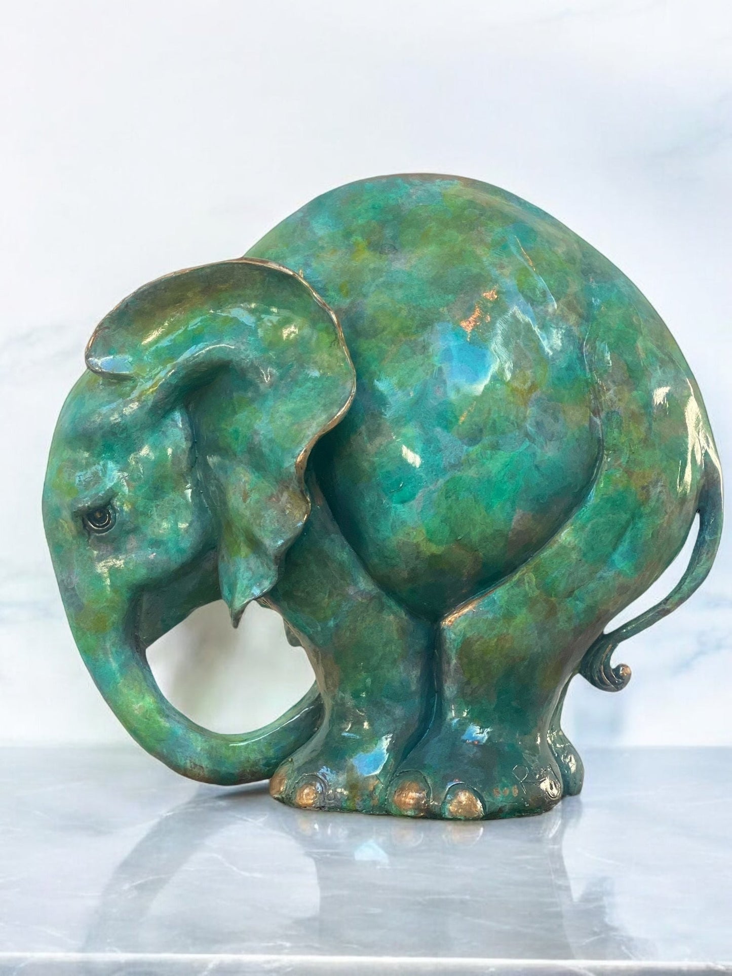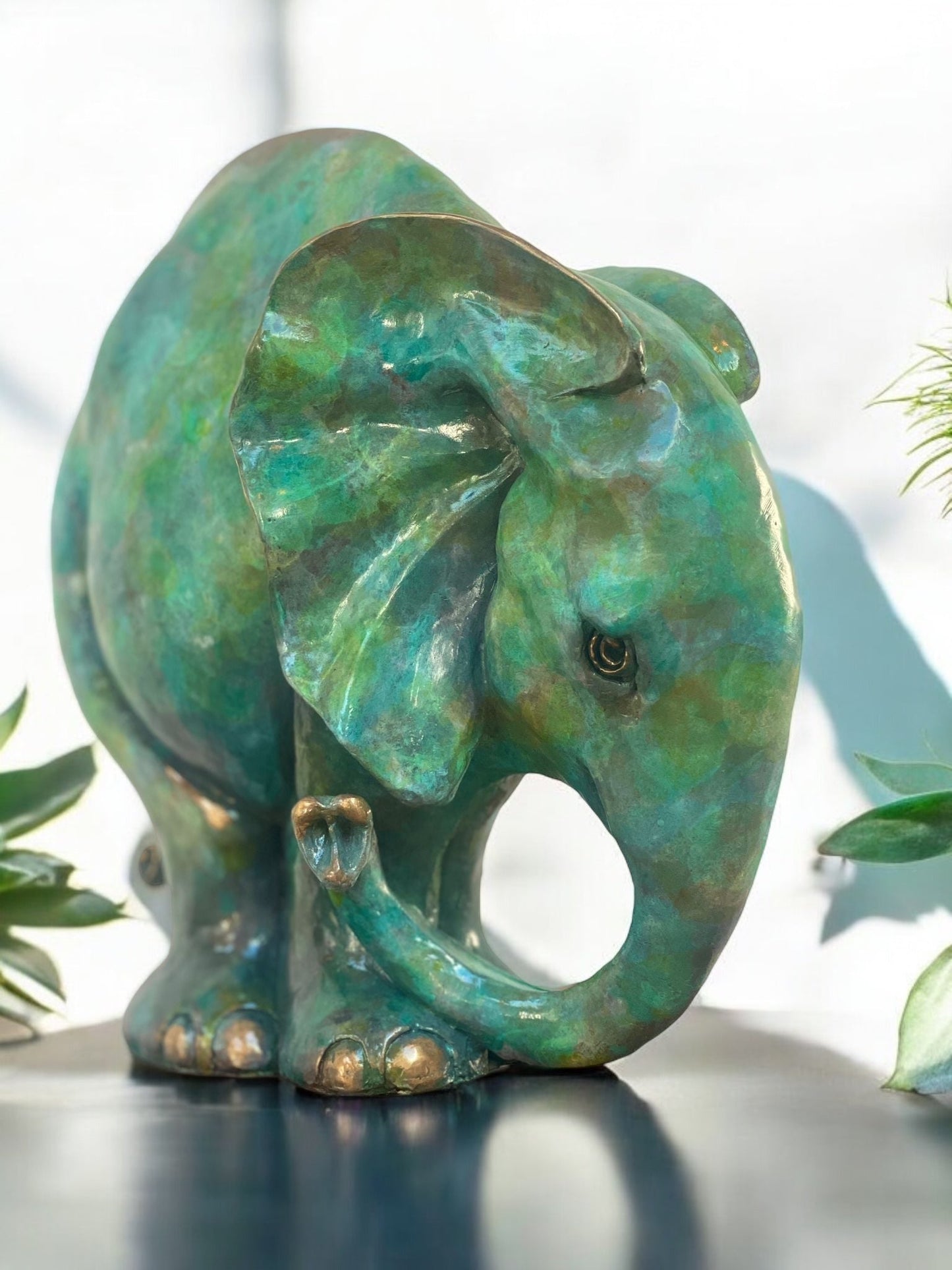 This beautiful bronze elephant is uniquely styled with a rounded, flowing shape, capturing the whimsical essence and gentle spirit of this magical creatures.“Bubbles” embodies these qualities for me also bringing a touch of happiness to any space.