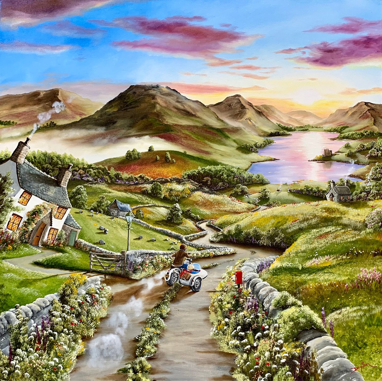 A fabulous Original painting by Caroline Deighton of a couple out on their motorbike and sidecar heading to the Castle On The Peninsula.