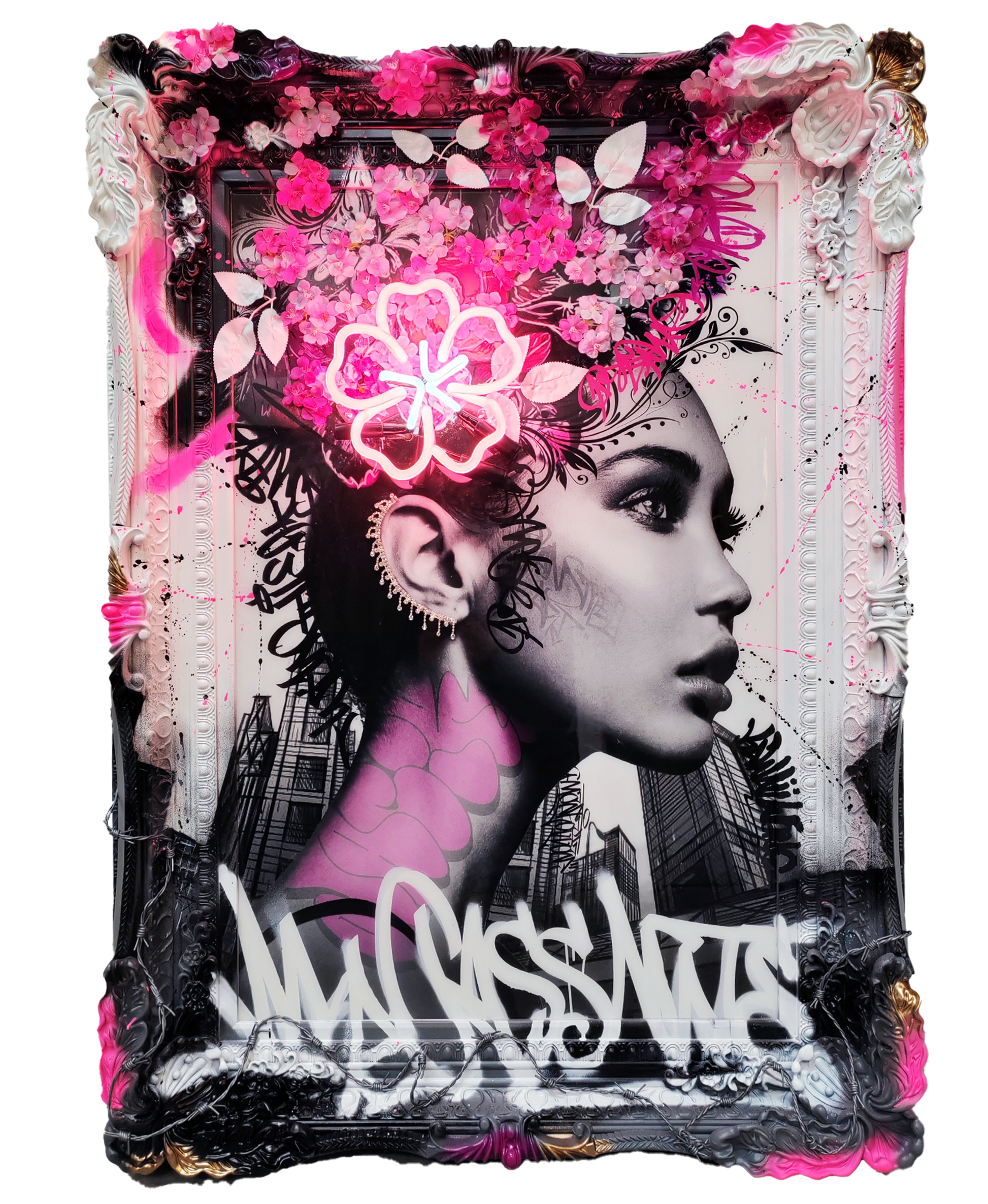 A bold, three-dimensional original artwork combining graffiti-style embellishments, spray-painted detailing and framed in an ornate swept frame, it balances urban energy with classic elegance. A vibrant neon light adds a striking glow, transforming the piece into a dynamic light installation.