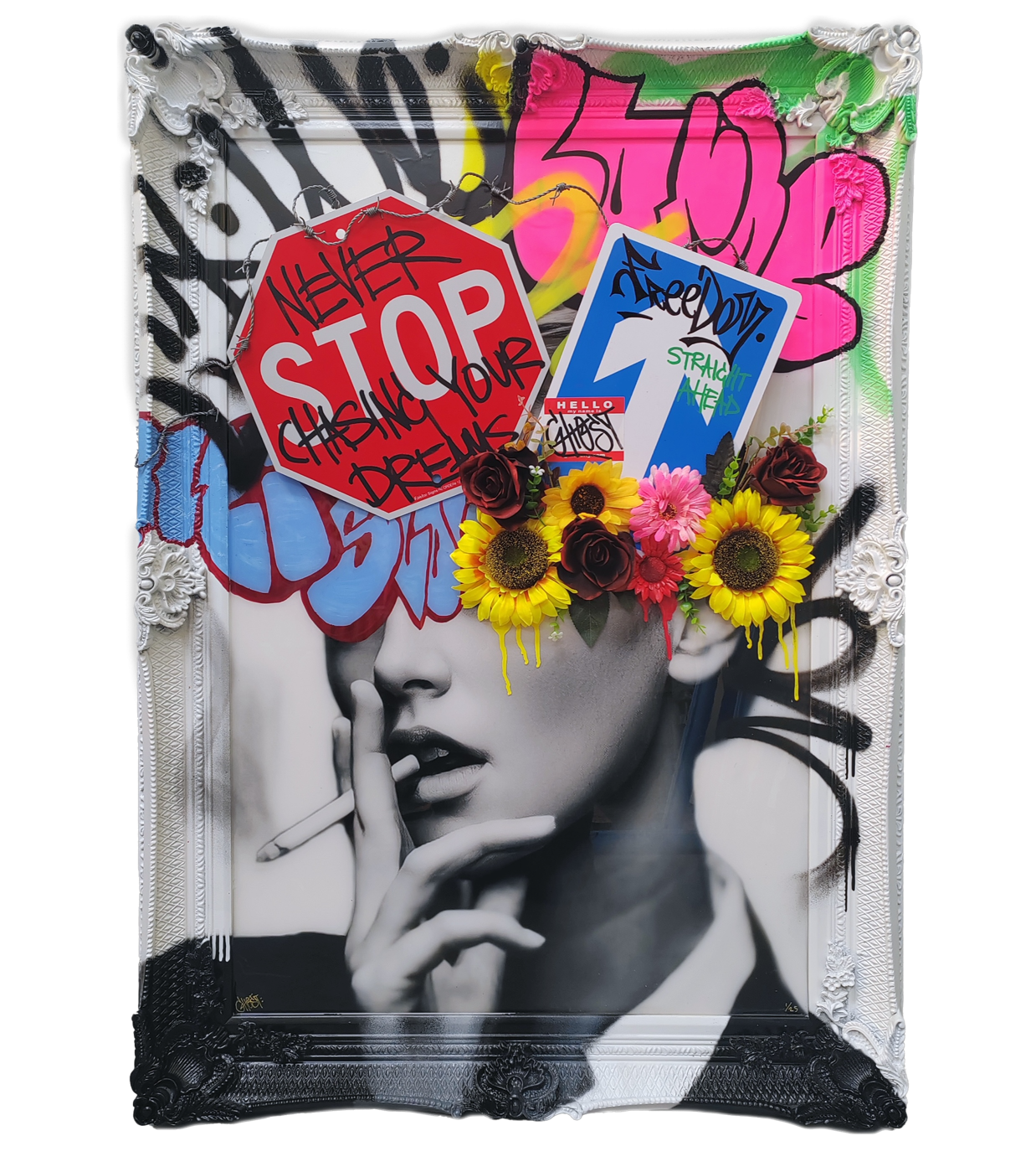 A bold, three-dimensional artwork combining graffiti-style embellishments, spray-painted detailing and framed in an ornate swept frame, it balances urban energy with classic elegance.