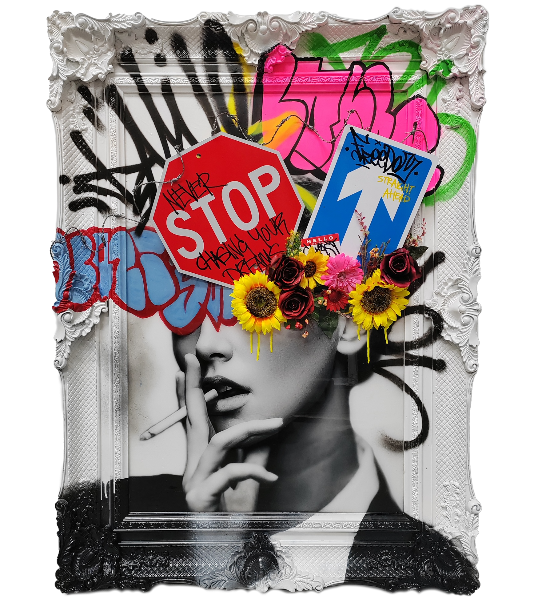 A bold, three-dimensional artwork combining graffiti-style embellishments, spray-painted detailing and framed in an ornate swept frame, it balances urban energy with classic elegance.