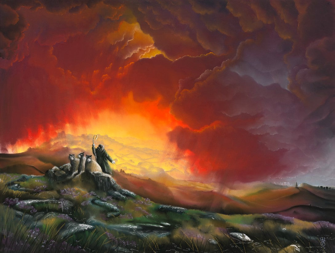 Classic Mackenzie Thorpe, this stunning piece symbolises unity and togetherness in the face of the stormy struggles of life, as represented by a shepherd guiding his flock through a storm, as Mackenzie remarks: "I draw the bright colours of love, the stormy struggles of life, the light at the end of the tunnel, all of life really".