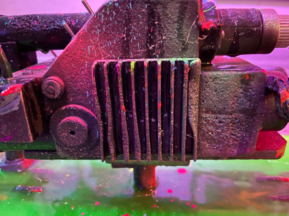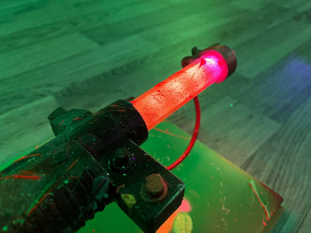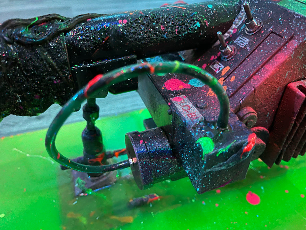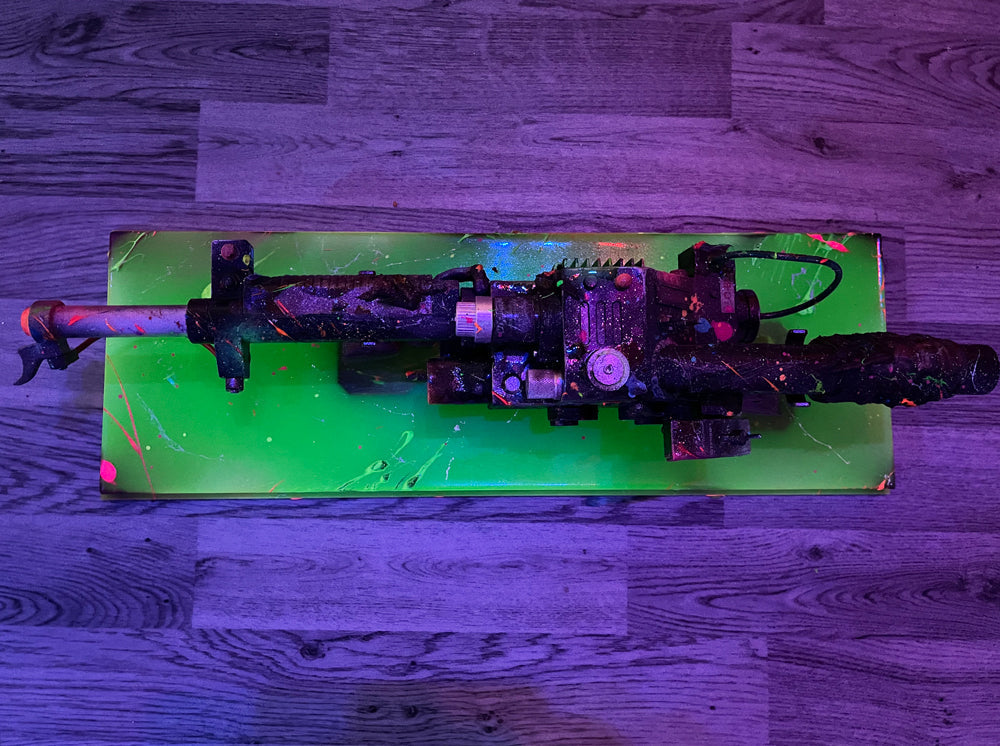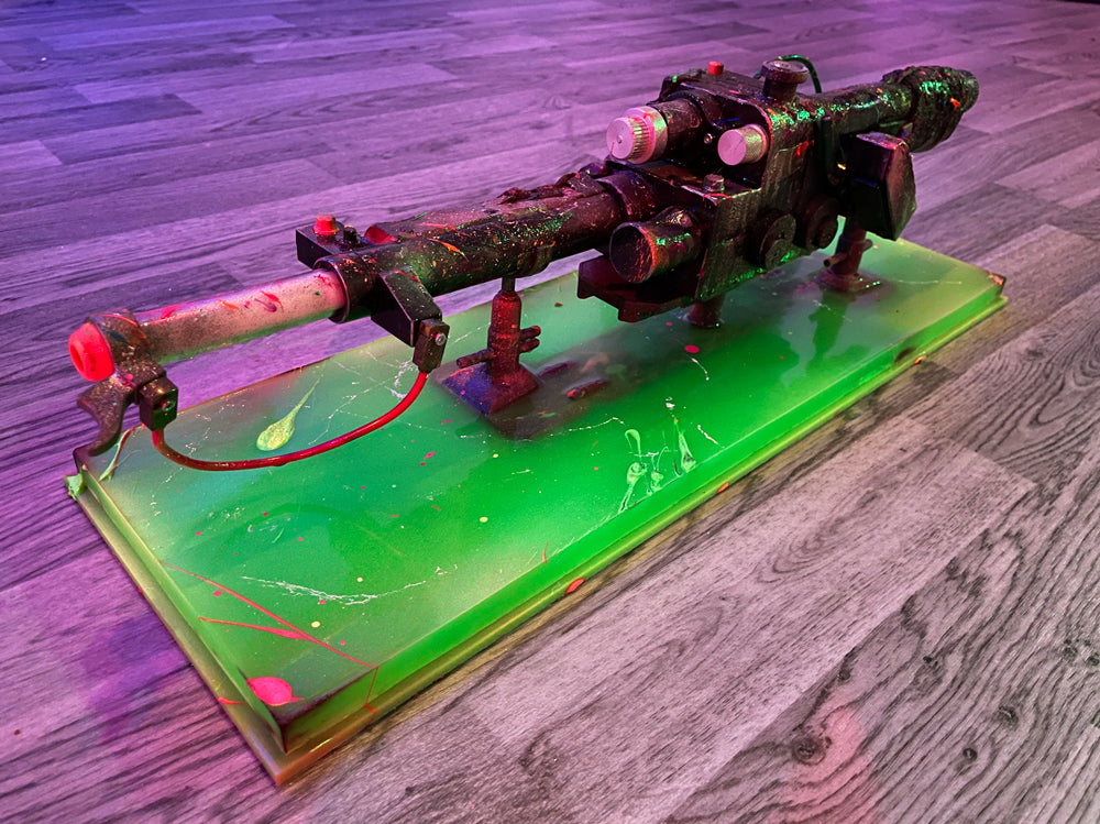 So, my ‘RETROPLASM’ series has given me the opportunity to build on this and do something much less dark, although I couldn’t resist getting the blow torch out! ‘Grab Your Stick’ has transformed one of the coolest movie props that there has even been and made it, well I guess, funkier, and that’s before you turn the lights off – yep, the resin base glows in the dark whilst the neon paint also comes alive under lairy coloured light.