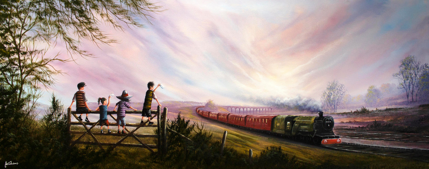 Get ready for a wild adventure with the Hankies At The Ready Original by Danny Abrahams! Featuring a nostalgic railway and children in awe of a steam train, this piece is perfect for those who love taking risks and embarking on thrilling journeys. Grab your hankies and get ready for an exhilarating ride!