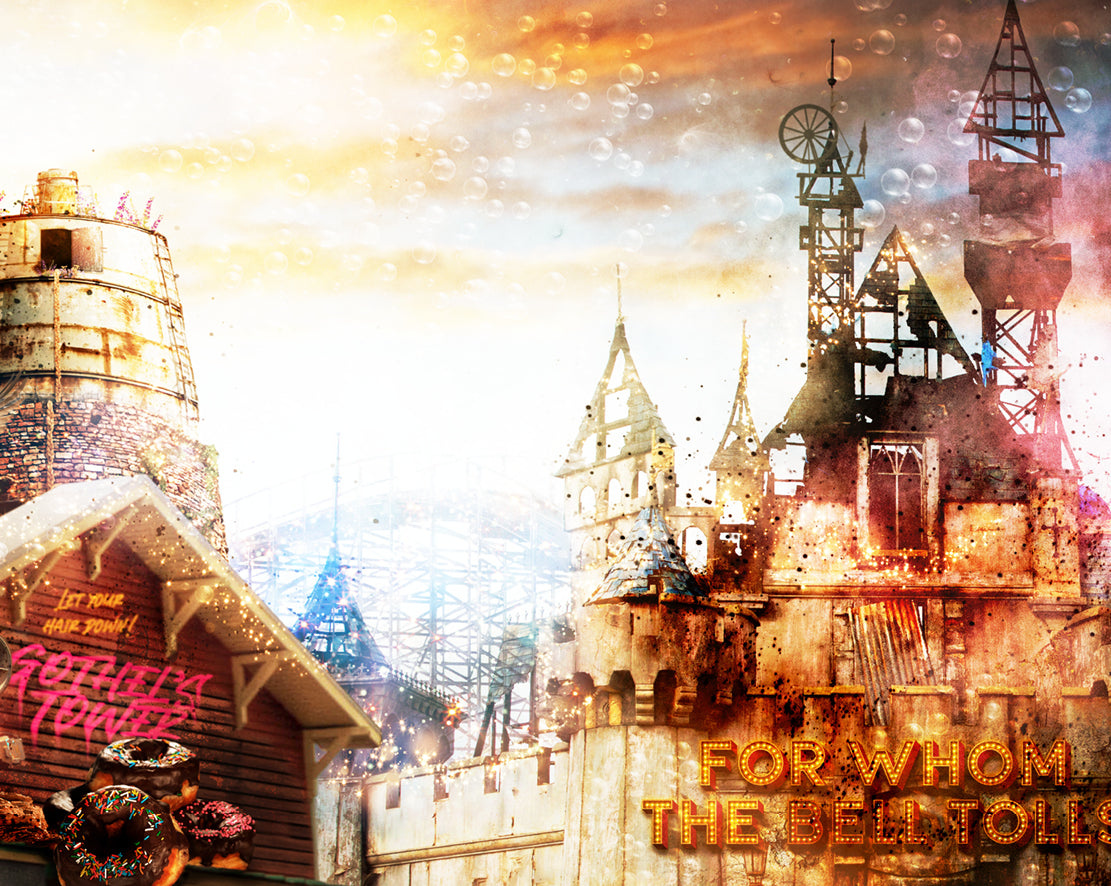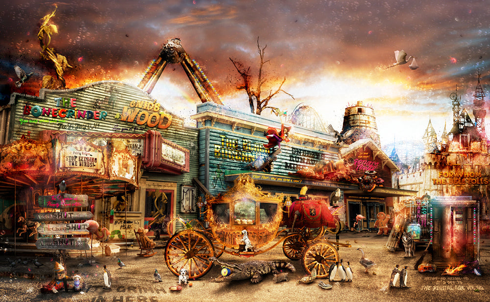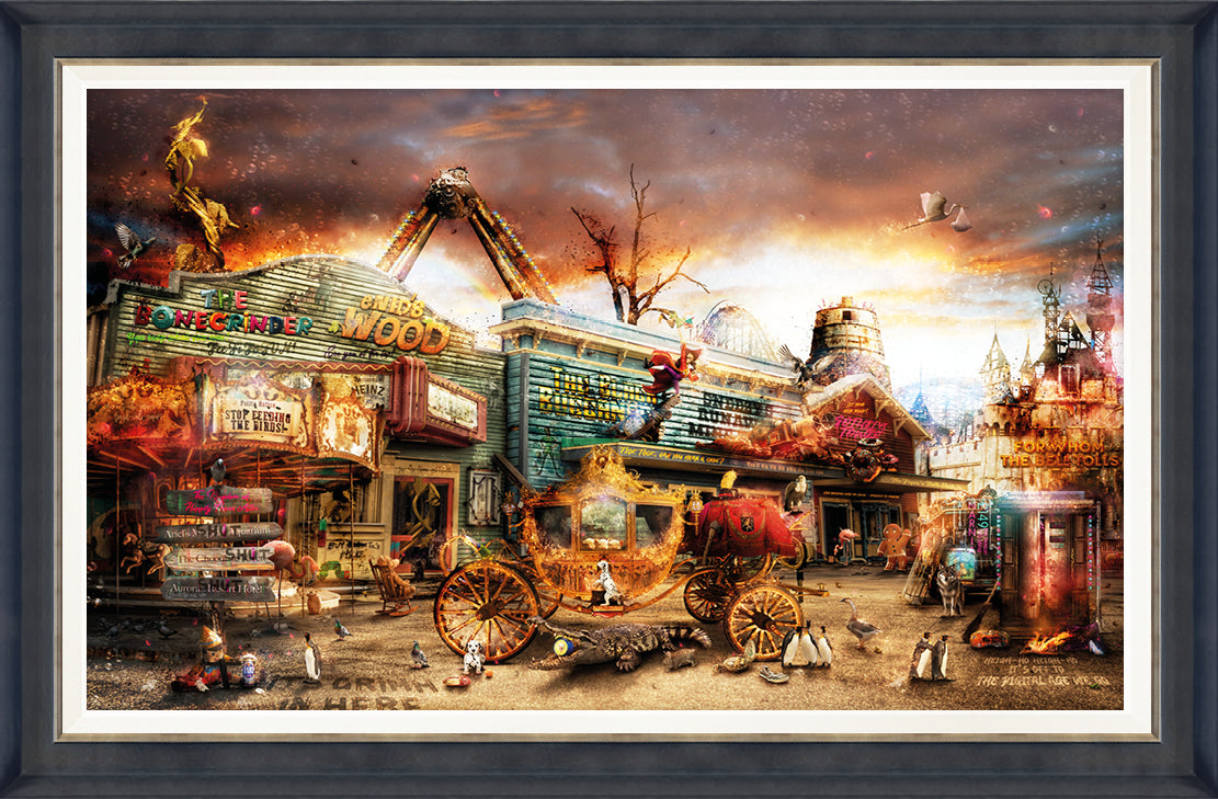 What I have done is to depict an abandoned theme park that has fallen into a state of disrepair through lack of use. There are so many links, big and small, to my earlier works, so many crazy references for you to seek out. Remember as a kid when you walked up to the entrance and you caught sight of the big rides in the distance, it was so exciting. For me, it was the ‘Meli’ park in De Panne – Belgium that captivated me and my imagination. I still seek out photos and videos online where possible – it seems like a different world back then. Smoutebollen changed my life!