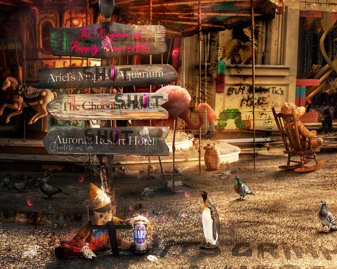 So, ten years into my art career and ‘Decadence’ has given me the perfect opportunity to work in that way and create my latest ‘Storyteller’ piece to hopefully show my wonderful and loyal collectors that there are so many more chapters left to write and to demonstrate how I have grown and evolved as an artist from a technical perspective and on production level also. Are you sitting comfortably? I present to you ‘Happily Never After – a striking image that is crammed full of detail, clues, hidden meaning, and references to Chapter One. Let’s begin…