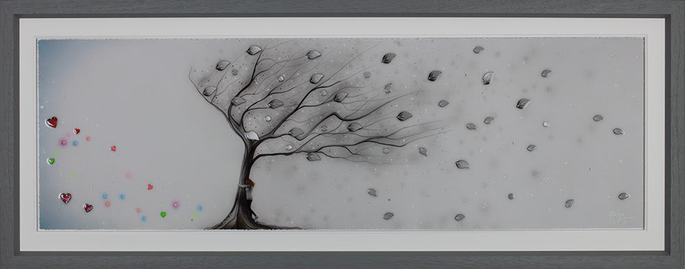 On deckled edge paper with hand embellishments before being framed and returned to Kealey to apply 3D resined elements to the glass!
