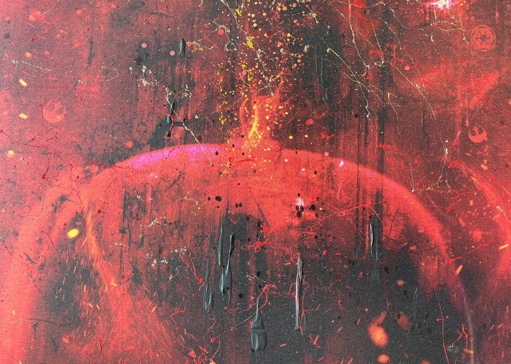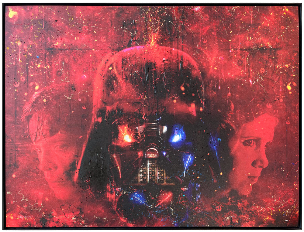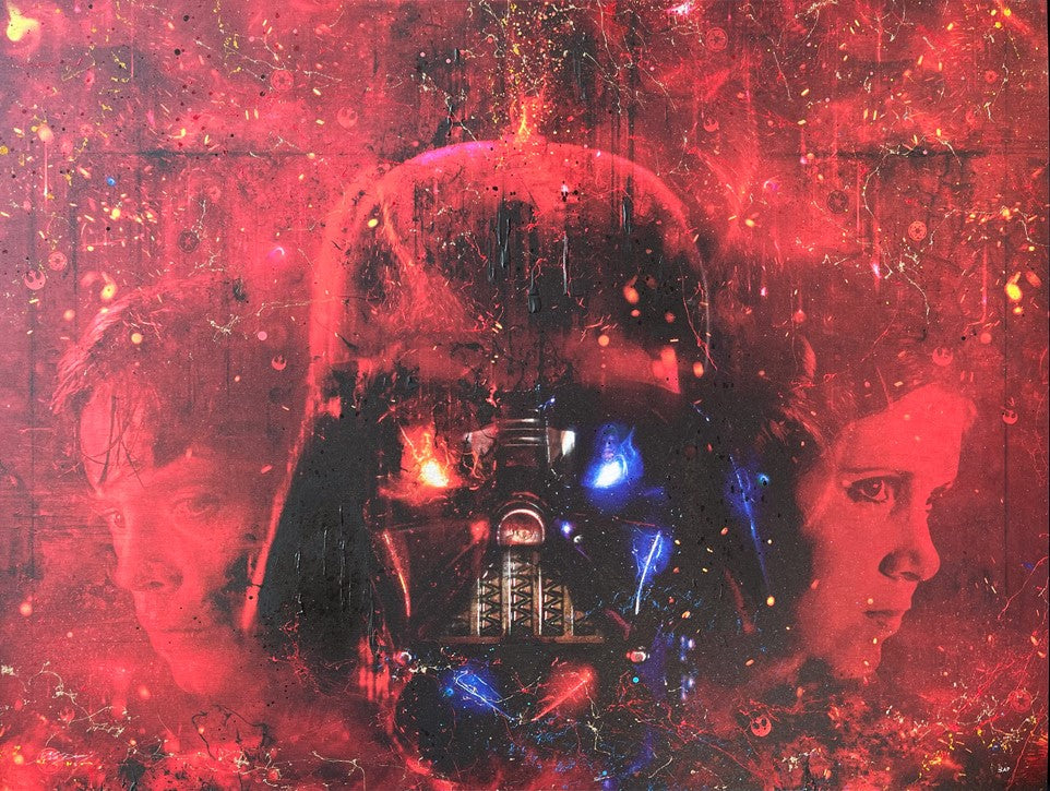 ‘I Am Your Father’ features Vader himself and then flanked by Luke and Leia, it just works so nicely! Is it just one or all three that wear a mask for protection? Look a little closer and you will spot Obi Wan Kenobi and the Emperor too! I could have kept this a black and white tonal piece and it would have worked so well, however I love how the red works so dramatically against the black, whilst the other colours add even more life into the scene.