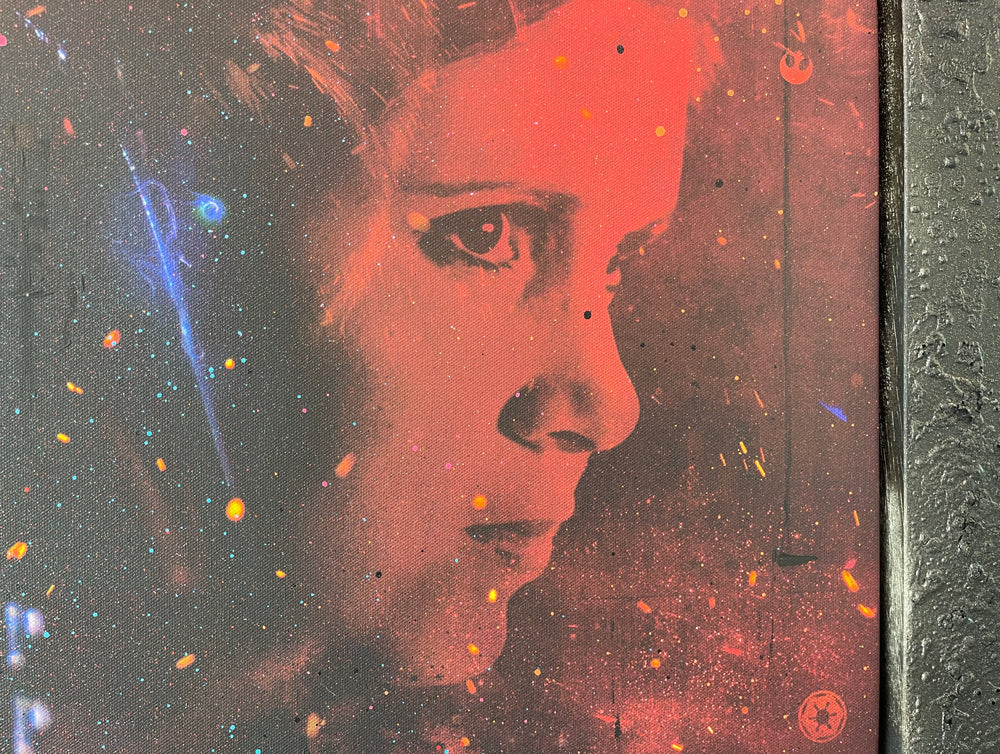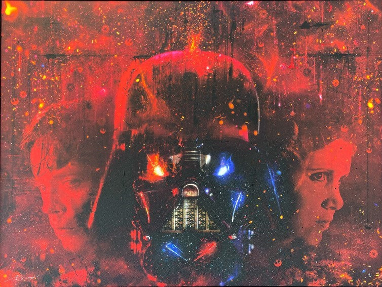 ‘I Am Your Father’ features Vader himself and then flanked by Luke and Leia, it just works so nicely! Is it just one or all three that wear a mask for protection? Look a little closer and you will spot Obi Wan Kenobi and the Emperor too! I could have kept this a black and white tonal piece and it would have worked so well, however I love how the red works so dramatically against the black, whilst the other colours add even more life into the scene.