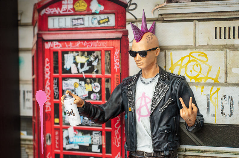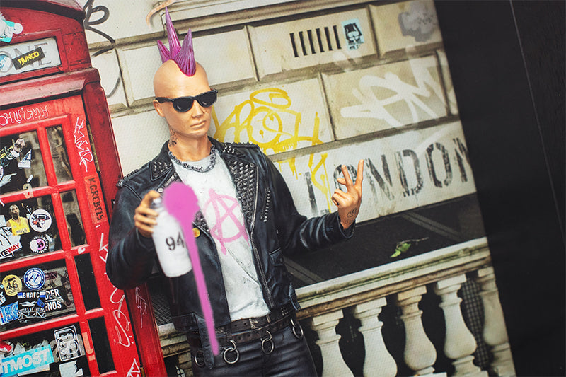 The Punks themselves have been designed and fabricated by JJ himself - before they are all hand-painted individually. The characters are then securely mounted to a London / Rule Britannia style canvas print that has been created especially for this new artwork. The entire piece is then fitted into purpose made shadow box frame - with matt black interior inserts and finished in a wide, contemporary black moulding profile.