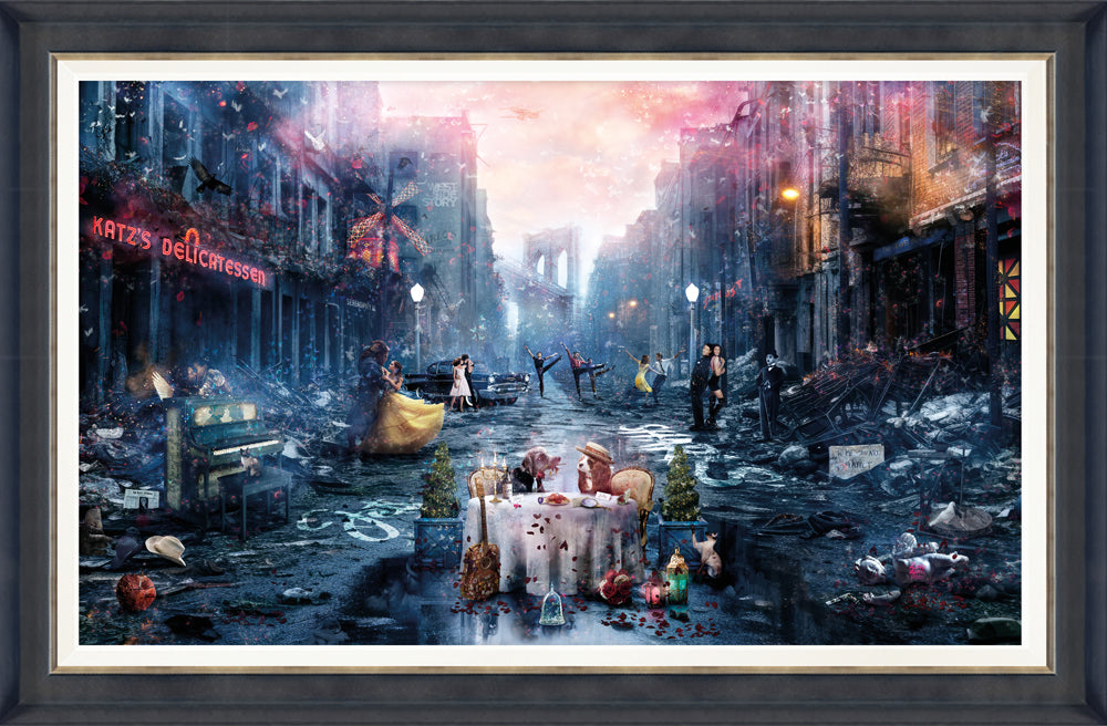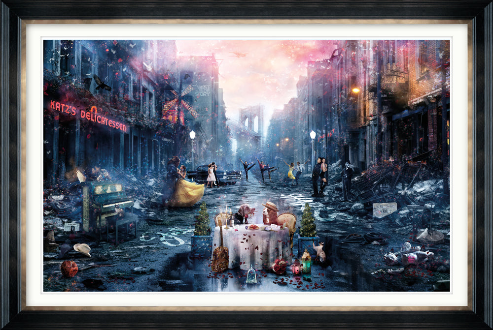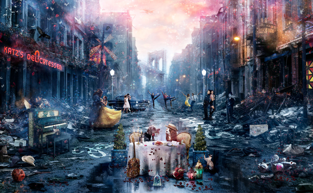 The intention for this piece was to start off with a gritty, almost post-apocalyptic scene of decay and neglect and then to set about transforming it so that you don’t notice what surrounds you, instead being overwhelmed by beauty and positivity. The idea being that true love can give you focus and hope. The central detail focuses on Lady and her ‘Tramp’ seated for their meal and completely and utterly consumed in each other’s presence and with all of what goes on around them falling silent. Really sweet and so, so honest. I won’t spoil it by listing out all of the detail, some is blatant, others are much more subtle and harder to digest, oh and if you decipher the teddy bear reference then you really are hard-core!