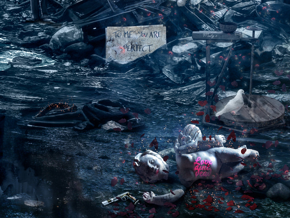 It’s not all about setting things on fire and mucky language here, I do have a soft side! I love to mix things up and everything is created for a reason, art with meaning, always for a reason. It’s important to stay authentic as an artist whilst also keeping the most important part, the collector at the forefront. I know everyone has a dark side but there is a lot of love out there too! ‘Love Ain’t Dead’ is a blend of my ‘Lost in Hollywood’ and ‘Storyteller’ signature styles, designed to yank at your heart strings and draw you in to seek out the meaning and the detail, guaranteeing a genuine love affair for all of you old-fashioned romantics!