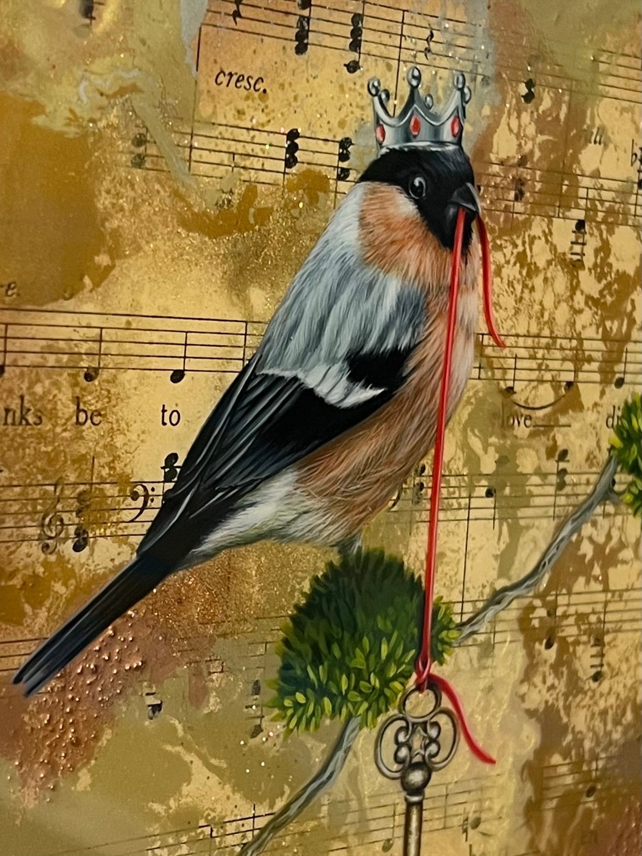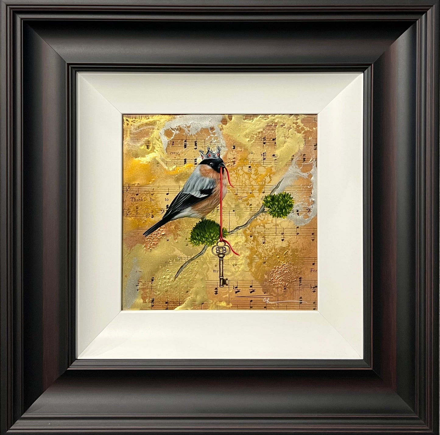 Experience the enchanting beauty and delicate details of "Love Is The Master Key" original painting by renowned artist Sarah Louise Ewing. Adorned with a small garden bird and a crown, this gorgeous painting is a beautiful representation of love's regal power.