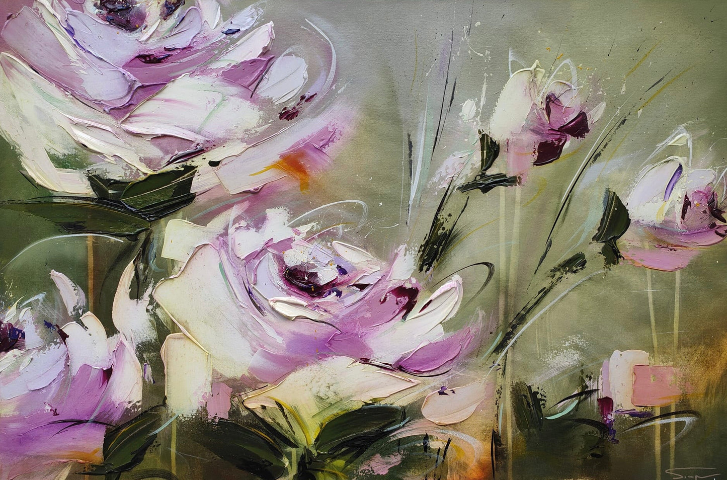 This is a truly beautiful canvas with the painted image continuing over the edges. Gorgeous lilacs with white and cream on a background of soft sage with areas of rich dark green. This is unframed, if you would like it framing then please contact us to discuss.