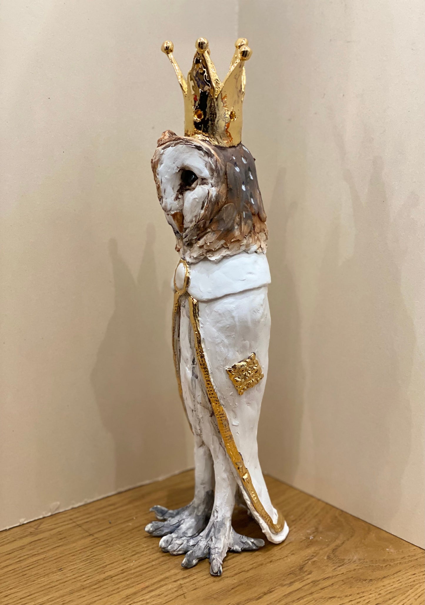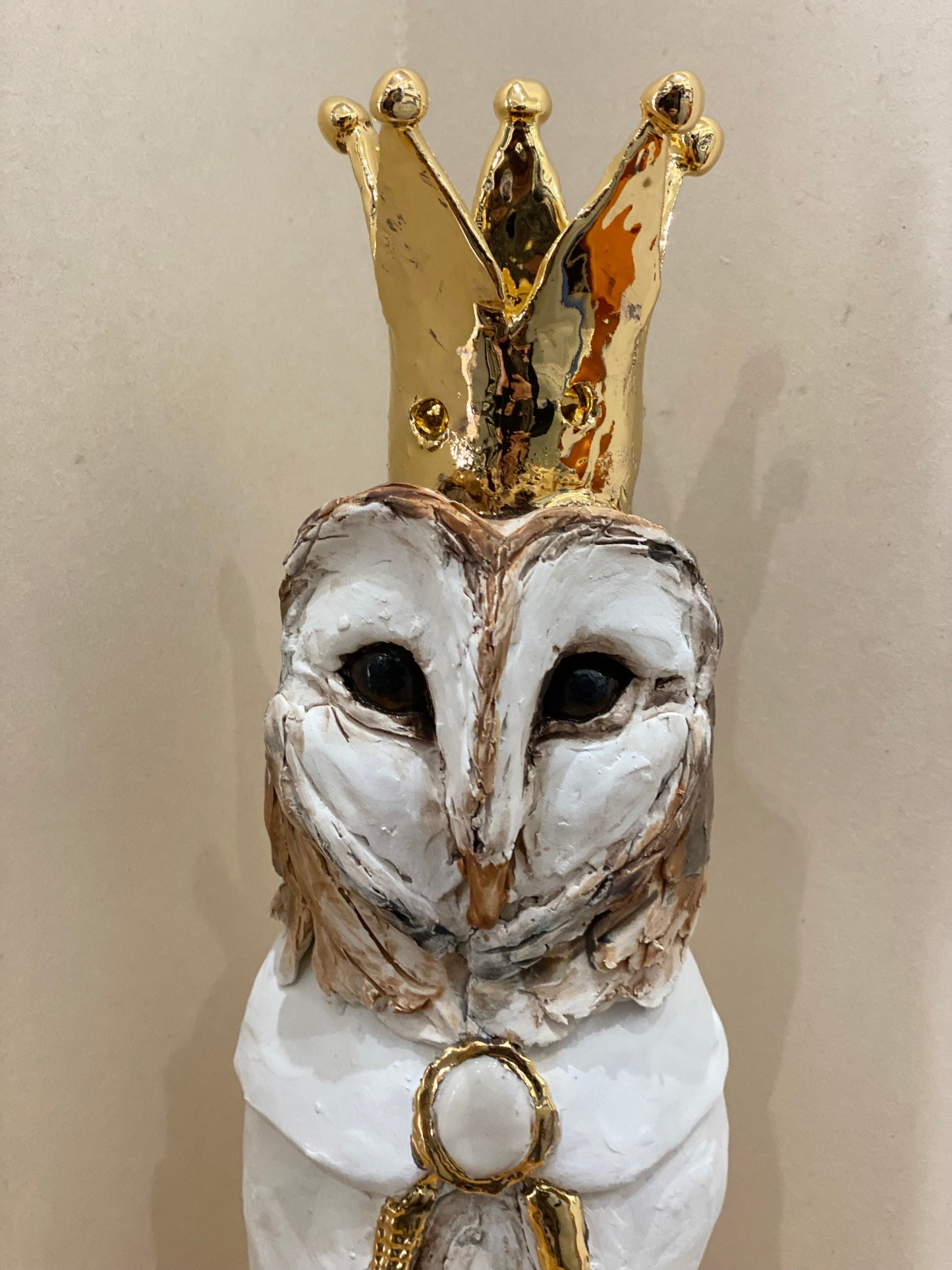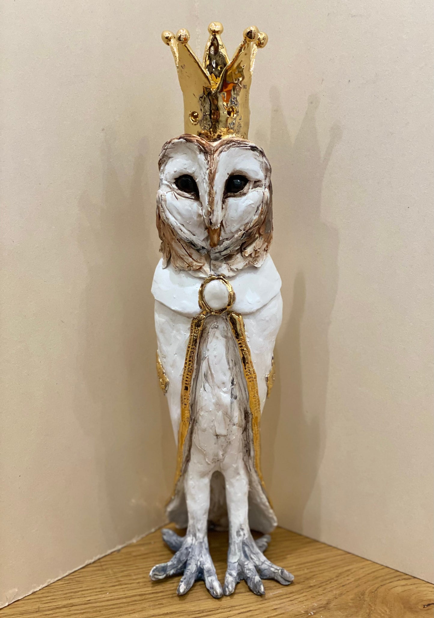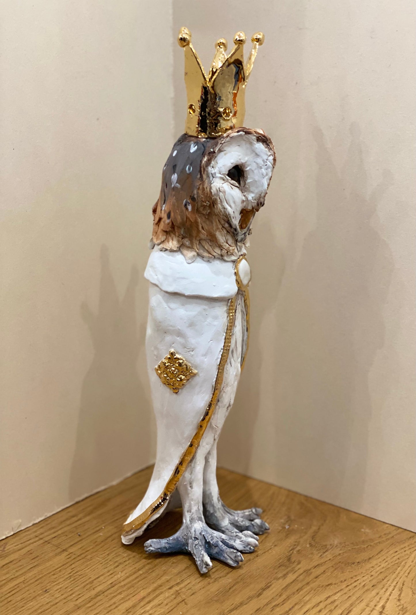 Experience the beauty of nature with our hand-crafted Standing Owl Original Sculpture by Louise Brown! This ceramic barn owl boasts a stunning shiny gold crown, making it a truly unique piece for your home decor.