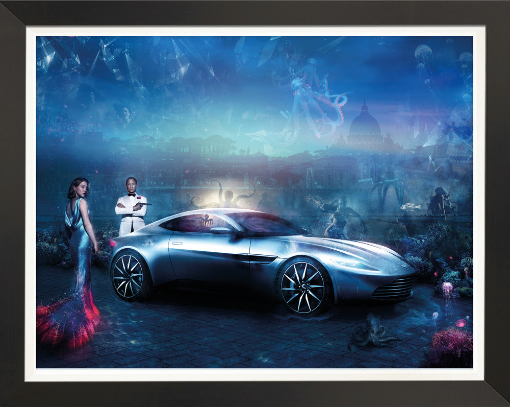 Memories of the classic Bond films as a kid are vivid and special and I cherish them. I lost my way with several of them after that but became drawn to them more for the beautiful introductions that showcase the lead song, they are works of art in themselves. ‘Skyfall’ was an incredible example of this, but it was the hypnotic and surreal qualities of ‘Spectre’ that stuck with me. It is just brilliant! I guess, it is that quality that I strive to inject into my work, and it has driven this piece. The scene is dominated by the beautiful Aston Martin DB10 that is flanked by the backdrop of Rome as Bond waits to welcome Madeleine Swann. The two characters add a real quality to the piece as their eyes are on you, helping to put you in the scene, or just outside of view. If you look closely, you will see that her dress is starting to morph into a mermaid’s tail, it is a beautiful addition.