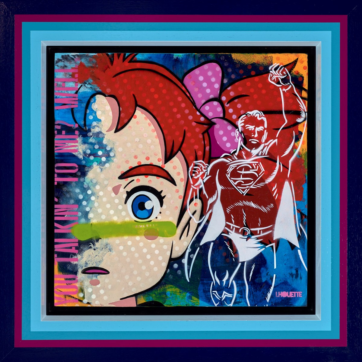 This piece is float framed in a geometric style square frame with bold colours bordered by an ornate gold surround, a juxtaposition of contemporary styles!
