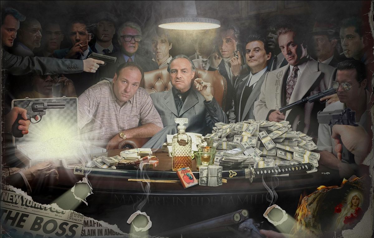 This composition brings together characters from iconic mobster/gangster films and shows, creating a fictional underworld “summit” of sorts.